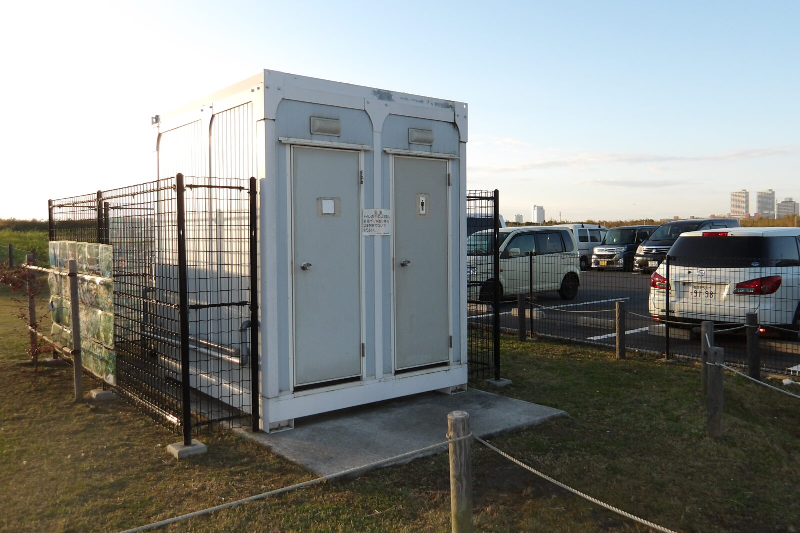 🟦青いエリアが駐車場。横にトイレが二つあります。